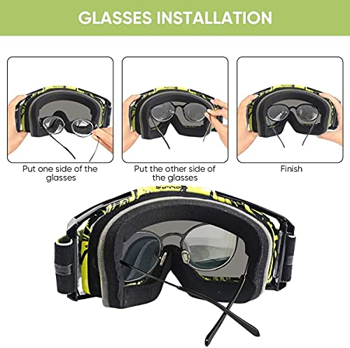 • Duże wzornictwo OTG: Dzięki konstrukcji OTG (nad okularami) okulary motocyklowe pozwalają nosić okulary pod okularami, a okulary są również odpowiednie dla tych, którzy noszą okulary. Idealnie nadaje się do jazdy na nartach, snowboardzie, jazdy na łyżwach, wspinaczki skałkowej, motocyklu / jazdy górskiej, jazdy samolotem, skoków na bungee i innych.