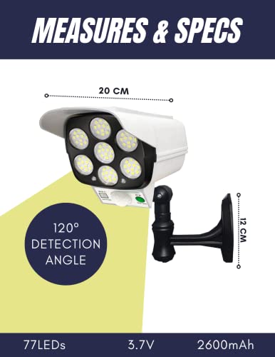 • CZUJNIK RUCHU: Jego zasięg wykrywania wynosi 120º, więc obejmuje w przybliżeniu od 8 do 10 metrów. Jeśli ktoś się zbliży, wykryje to i zapali. Współpracuje z 77 diodami LED SMD.
