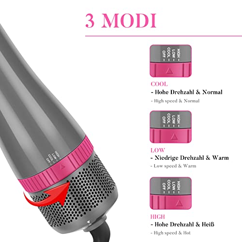 3 TRYBY —: 3 TRYBY — Wbudowany wentylator o mocy 1000 W, szybkie suszenie i stylizacja. 3 poziomy ogrzewania i 2 poziomy wentylatora. Różne prędkości wentylatora i temperatury są dopasowane do różnych akcesoriów do stylizacji i oferują różnorodne opcje stylizacji. Ustawienie HIGH dla grubych włosów i ustawie