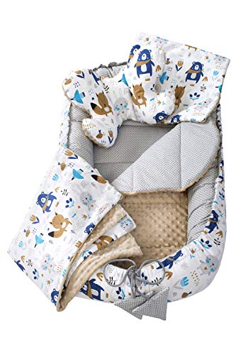 5 teilig Babynestchen Set Babynest 90×50 herausnehmbarer Einsatz Bett Kuschelnest Krabbeldecke Medi Partners für Babys Neugeborene 100% Baumwolle (Boho mit Beige Minky)