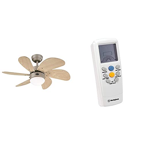 Einzelheiten: 76 cm Deckenventilator Turbo Swirl 78158 mit Einzelleuchte und sechs Flügeln, Ausführung in Titan mit OpalmilchglasDer Turbo Swirl von Westinghouse bietet eine bemerkenswerte Luftzirkulation in einem kompakten Deckenventilator mit sechs Flügeln. Neben seiner außergewöhnlichen Leistung sieht der Turbo Swirl aber auch noch hervorragend aus. Artikelnummer 78158.Westinghouse Lighting 77874 Funk-Thermostat für Deckenventilator und Fernbedienung für die BeleuchtungWestinghouse Fernbedienung mit Thermostat für Deckenventilator und Beleuchtung. Die Westinghouse Funkfernbedienung ermöglicht Ihnen die einfache Regelung von 3 Geschwindigkeits- und Lichteinstellungen an Ihrem Deckenventilator. Mit der integrierten Temperatur- und Zeitsteuerung können Deckenventilator und Beleuchtung je nach Einstellung automatisch ein- oder ausgeschaltet werden. Der LCD-Display zeigt immer die aktuelle Raumtemperatur an. Ein idealer Ersatz für eine Zugketten- oder Wandschaltersteuerung. Artikelnummer 77874.