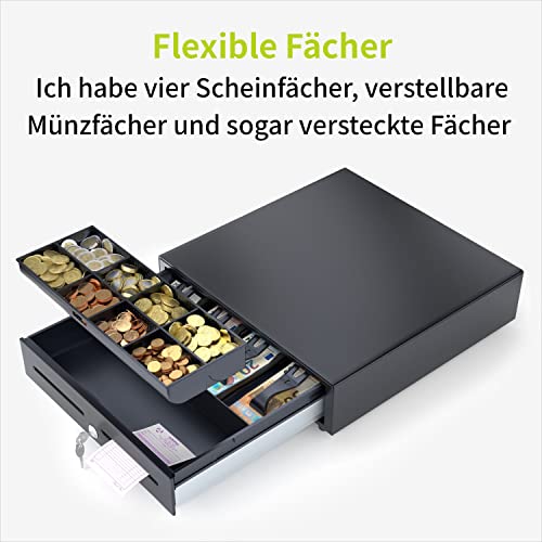 • ABSCHLIEßBAR – Geldschublade mit Schloss. Abschließbar mit den 2 beigelieferten Schlüssel. Die Kasse besteht aus robustem und stoßfestem Stahl.