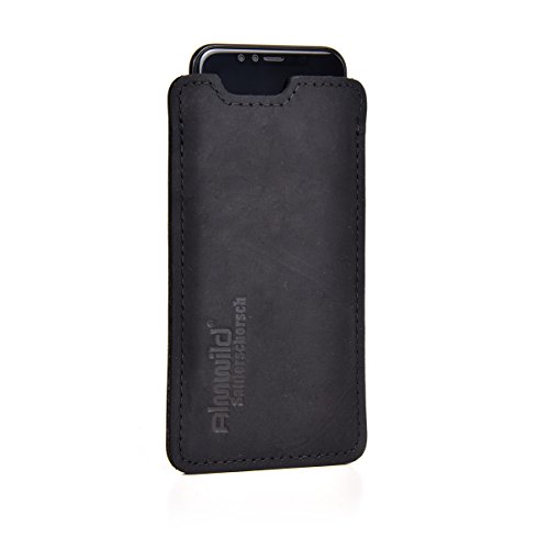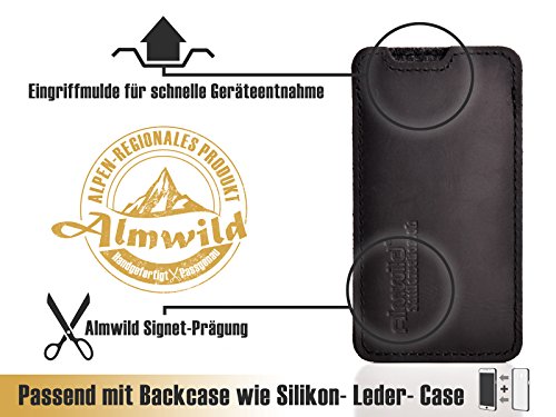 ALMWILD® Etui pasujące do Apple iPhone 14/14 Pro, 13/13 Pro, 12/12 Pro ze skórą/silikonowym etui z prawdziwej skóry bydlęcej w kolorze czarnym. Model Sattlerschorsch
