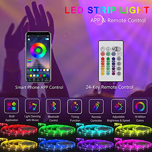• 【Ściemnialna taśma LED】 Ta taśma LED 10M ma wysokiej jakości diodę LED 5050 SMD. Za pomocą 24-klawiszowego pilota lub telefonu komórkowego można sterować 16 milionami kolorów paska LED Bluetooth i 30 dynamicznymi trybami, takimi jak miganie, oddychanie, miganie, stopniowa zmiana itp.
