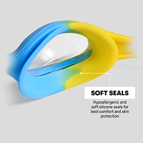 • Okulary pływackie mają powłokę przeciwmgielną, ochronę przed promieniowaniem UV i nie zawierają PVC