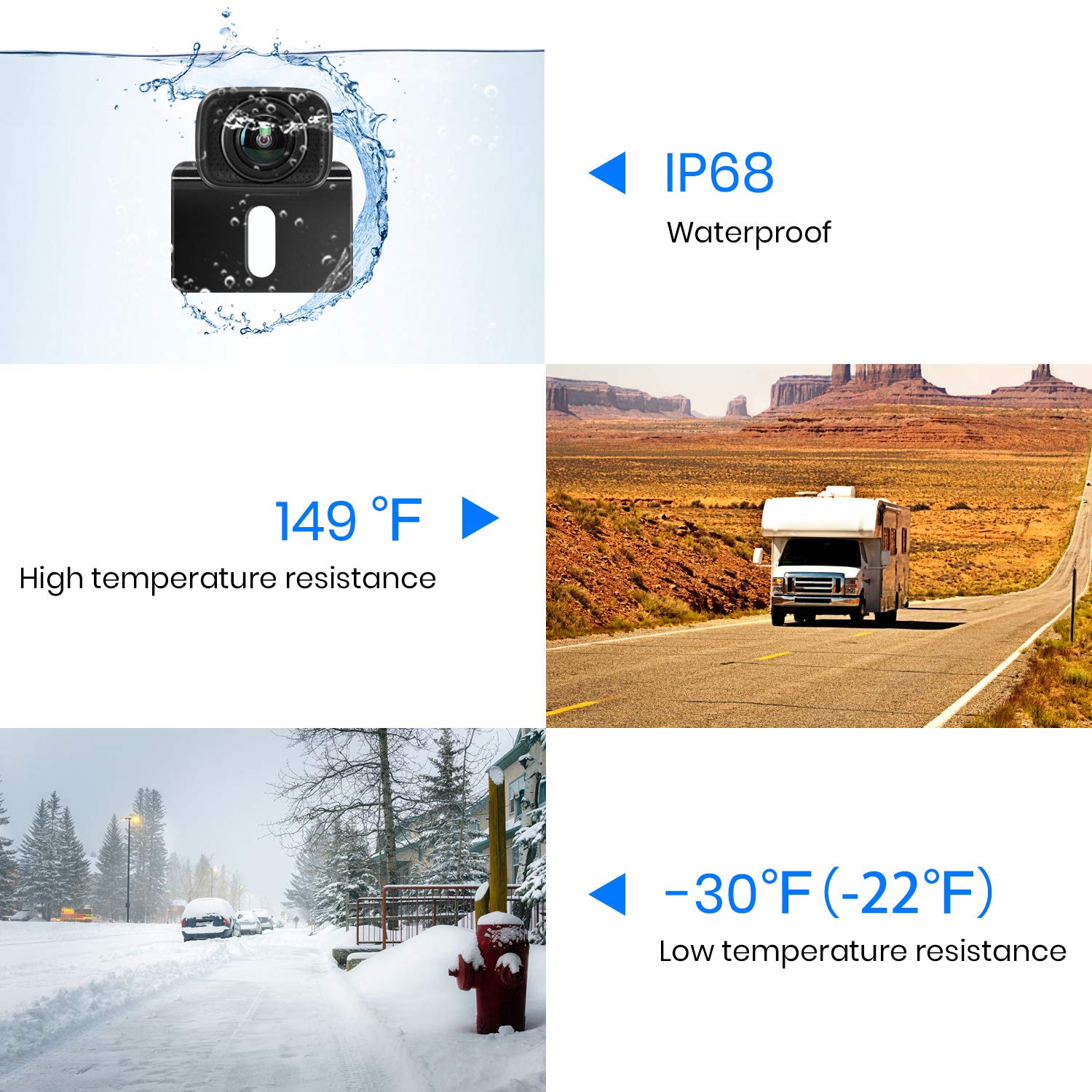 ✅ 【Super kamera tylna】: 【Super kamera tylna】 5 całkowicie szklanych obiektywów, czujnik koloru 1/3 CMOS i oświetlenie 0,1 luksa zapewniają doskonałe widzenie w nocy przy słabym świetle. Wodoodporna i trwała kamera tylna IP68 doskonale sprawdzi się w deszczowe dni i wytrzymuje ekstremalne temperatury od -20°C do 65°C.