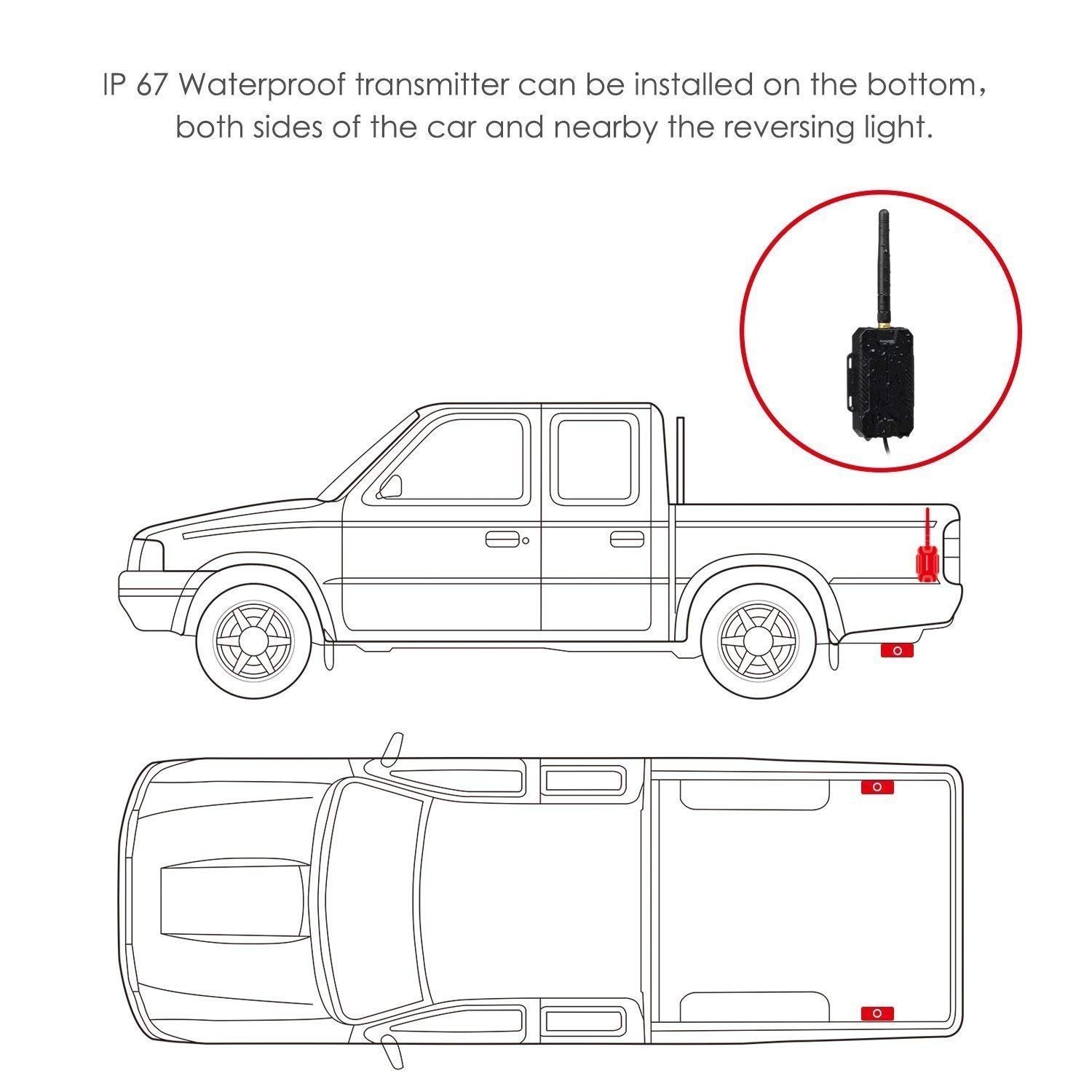 AUTO-VOX T1400 W bezprzewodowy zestaw kamery cofania, bezprzewodowy system wspomagania parkowania, monitor lusterka wstecznego z kamerą zapasową, nadajnik radiowy, wodoszczelność IP68 LED, super