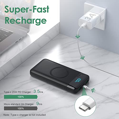 • 【2 wejścia wejściowe】Obsługuje 2 porty USB do szybkiego ładowania: ❶25 W PD, ❷ USB-A 2.1 A. do ładowania bezprzewodowego powerbanku przez micro USB 2.1 A. Trwa to około 8-10 godzin.