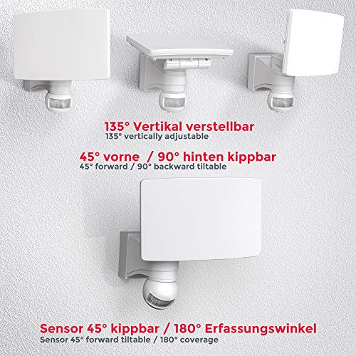 • Mit einer Lebensdauer von 50.000 Stunden ist diese Wandbeleuchtung perfekt für Haus und Hof, um diese sicherer und angenehmer zu gestalten, denn 4000 Kelvin und 2300 lm garantieren leuchtend helles Licht. Lieferumfang: B.K.Licht LED Aussenleuchte mit Sensor. Die perfekte Aussenbeleuchtung für die Hauswand oder den Treppenaufgang. Neigbar und schwenkbar. Farbe: Weiß. Nicht dimmbar! Außenlampen und Aussenleuchten können um Ihr Haus und auf Ihrem Balkon eine schöne Atmosphäre erzeugen