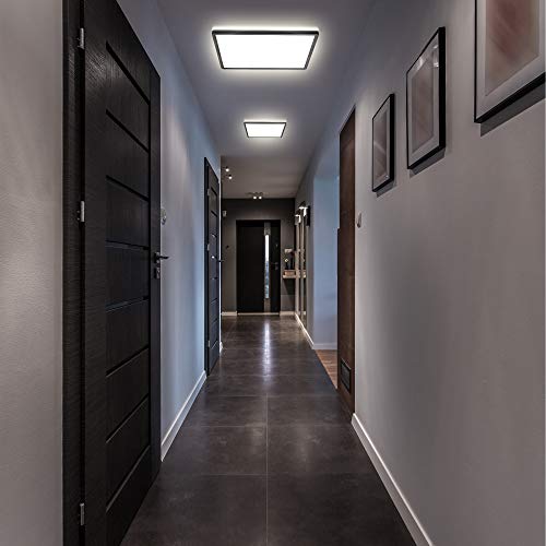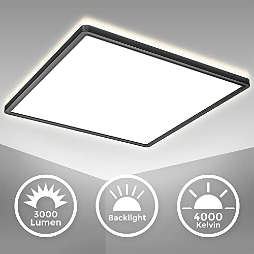 B.K.Licht Kwadratowa lampa sufitowa LED, 420 mm, ultrapłaska, tylko 29 mm wysokości, wbudowana płyta LED 22 W, neutralna biel 4000 k, 3000 lumenów, pośrednie podświetlenie sufitowe, czarne wykończenie, nowoczesny panel sufitowy, IP20