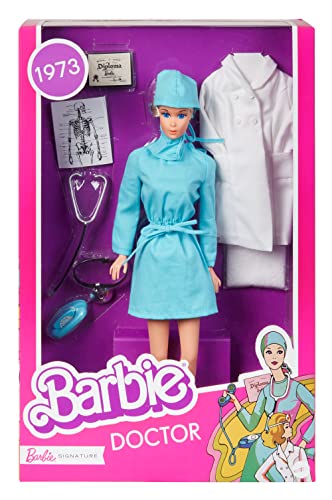 Barbie GTJ94 – Barbie Signature Repro 1973 Doctor Barbie Lalka Reprodukcja klasycznej lalki lekarskiej w odzieży operacyjnej, z płaszczem laboratoryjnym i akcesoriami, prezent dla kolekcjonerów