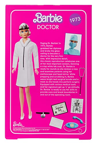 Barbie świętuje jeden z najważniejszych kroków kariery poprzez reprodukcję klasycznej lalki Barbie z 1973 roku, która pozwala na ożywienie wspomnień. Podczas gdy Dr. Barbie przygotowuje się do zastosowania w OP, zapewnia atrakcyjną turkusową odzież OP i ochronę ust i nosa. W promieniująco białym płaszczu laboratoryjnym Dr. Barbie jest gotowy do studia zdjęć rentgenów i badania pacjentów ze stetoskopem i lusterkiem czołowym. Białe buty w kształcie romby, prosty węzeł do włosów i pomalowane na czerwono paznokcie dopełniają profesjonalny wygląd. W skład wyposażenia wchodzą: diplom, stetoskop, lusterko czołowe, folia rentgenowska, telefon i ręcznik materiałowy.