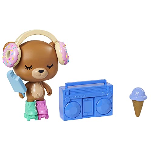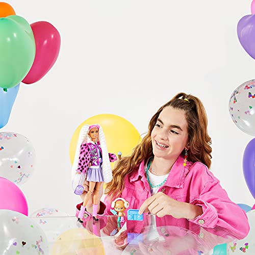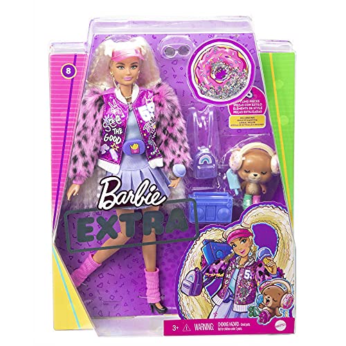 Barbie GYJ77 – Extra lalka #8 z żakietem z rękawami wykończonymi futerkiem i małym misiem dla dzieci, wiek 3+