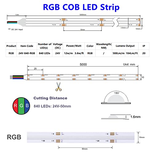 Taśma LED RGB COB, 24 V, 840 diod LED/m, CRI90+ FCOB, elastyczna taśma LED, 5 m, 4200 diod LED, super jasna taśma RGB COB LED do szafki, kuchni, projektów oświetlenia DIY