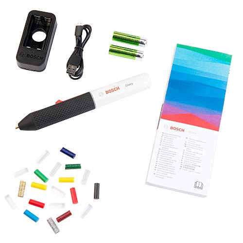 • Lieferumfang: Gluey Klebestift, farbige Kappe in Smoky Grey Grau, 2x AA Akku, USB Ladegerät und Kabel, 20 Mini Glue Heißkleber Sticks (8x Transparent, 2x Gelb, 2x Rot, 1x Blau, 1x Schwarz, 1x Rot Glitzer, 1x Grün Glitzer, 1x Blau Glitzer, 1x Silber Glitzer, 1x Gold Glitzer) Karton