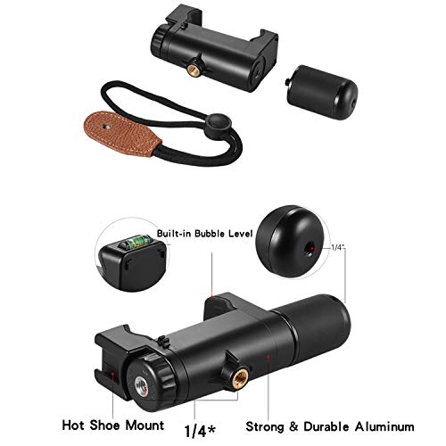 • Uchwyt uchwytu do smartfona posiada wyściełany uchwyt uchwytu, regulowany pasek na nadgarstek, poziom ducha, męskie i żeńskie nitki statywu oraz uchwyt na zimne buty