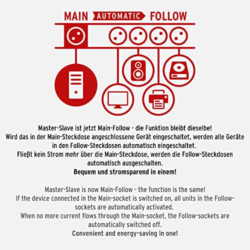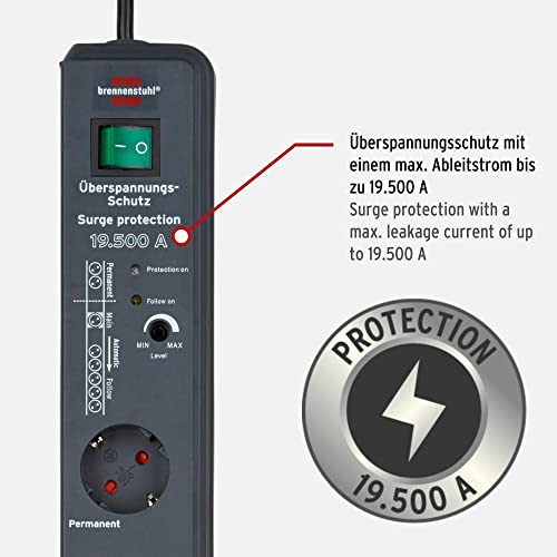 Einzelheiten: Die Secure-Tec 8er Mehrfach-Steckdosenleiste von Brennenstuhl in der Farbe anthrazit und 3m Kabel besticht durch ihre Qualität und Sicherheit in allen Bereichen. Das Gerät hat ein praktisches Automatik-Schaltsystem mit Main Follow Funktion. Das Main-Gerät (z.B. einen Computer) kann die Follow-Geräte (z.B. Monitor, Soundsystem, Drucker, Scanner usw.) in die automatische Steuerung mit einbeziehen. Mit dem Ein/Aus Schalter des Gerätes (in roten Main-Steckdose eingesteckt) können alle Geräte (in den Follow-Steckdosen) automatisch mit ein und ausgeschaltet werden. Sie verfügt nicht nur über einen erhöhten Berührungsschutz, sondern überzeugt außerdem durch folgende Eigenschaften:Schützt wertvolle Geräte vor Überspannungen mit einem max. Ableitstrom bis zu 19.500 AMit dem Ein/Aus Schalter des Gerätes, welches in der Main-Steckdose eingesteckt ist, können alle Geräte in den Follow-Steckdosen automatisch mit ein- und ausgeschaltet werdenHoher Komfort durch 1 Main (3500 W) und 5 Follow-Steckdosen (3500 W)Einstellbare Schaltschwelle (ca. 8 bis 80 W)Je eine Funktionskontroll-Leuchte für Überspannungsschutz und Follow-SteckdosenSteckdosen mit erhöhtem Berührungsschutz in praktischer 45°-AnordnungGesamtleistung max. 16 A/3500 WExtra langes Kabel 3 mNennstrom 16 AZusätzliche Ausstattung 2 Permanent-SteckdosenStecksystem DE