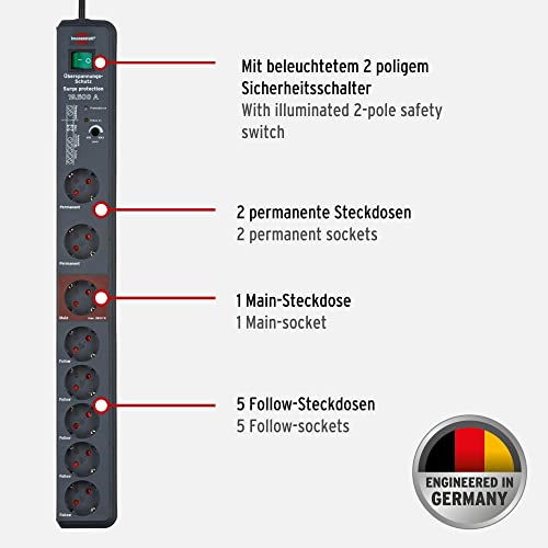 Brennenstuhl Secure-Tec, Steckdosenleiste 8-fach mit Überspannungsschutz und Main Follow Funktion (Mehrfachsteckdose mit 3m Kabel und Schalter) anthrazit