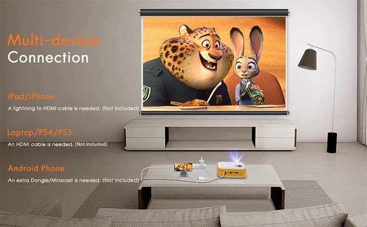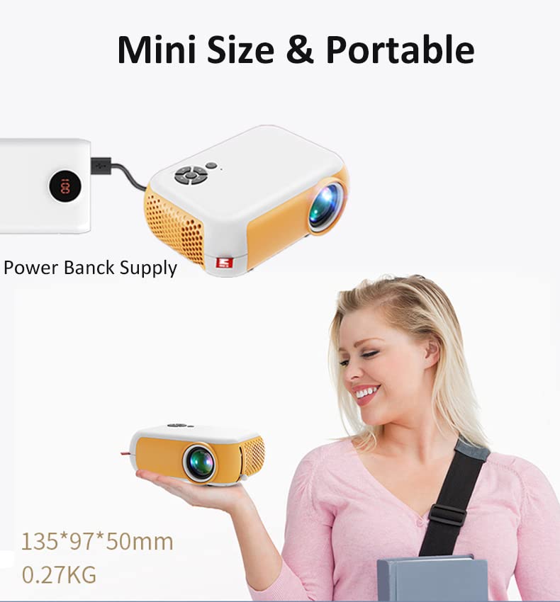• Przenośny i multimedialny – przenośny mini rozmiar sprawia, że projektor jest łatwy do przenoszenia. Przenośny projektor filmowy z portem USB, HDMI, AV IR, 5-in i portami kart SD, może być podłączony do różnych urządzeń takich jak laptopy, TV stick, PS4, odtwarzacz DVD, karty USB. Odtwarzacz multimedialny i projektor mogą być odtwarzane w tym samym czasie.