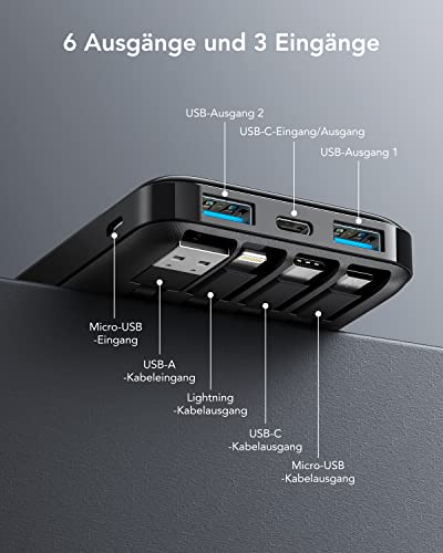 • 2. Spełnij swoje wymagania dotyczące ładowania: ponad 3 kable wyjściowe, powerbank jest również wyposażony w 3 niezależne porty wyjściowe (3 x USB + 1 * typ C), można ładować do 6 urządzeń jednocześnie.