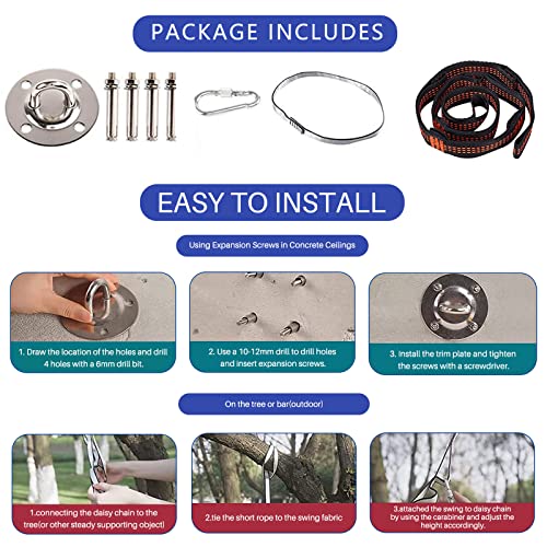 • Bezpieczna i łatwa w obsłudze: Dołączona tarcza mocująca może utrzymać to bezpieczeństwo i zapewnia wystarczająco dużo bezpieczeństwa. Instalacja trwa kilka minut i można ją bez problemu zainstalować w pomieszczeniach na suficie lub na zewnątrz. Ta huśtawka terapeutyczna dla dzieci może być zainstalowana w pomieszczeniach takich jak salon, sypialnia, biuro itd. lub na zewnątrz na werandzie, huśtawce lub drzewie.