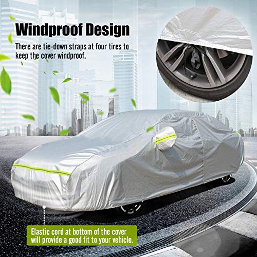 【Konstrukcja wiatroodporna】 –: 【Konstrukcja wiatroodporna】 – Elastyczny sznurek na spodzie pokrowca zapewnia lepsze dopasowanie do samochodu. Na czterech oponach znajdują się również pasy mocujące, które chronią pokrowiec przed wiatrem. Dobrze uszyty dwukrotnie, dzięki czemu pokrowiec jest trwalszy.