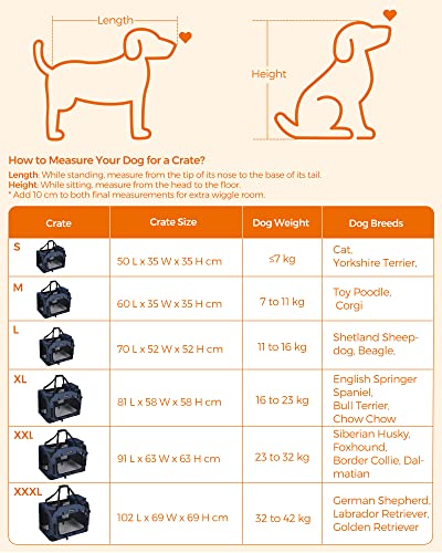 - Die richtige Größe feststellen: Die Hundebox (81 x 58 x 58 cm) ist für Hunde mit einem Gewicht zwischen 16-23 kg geeignet. Empfohlene Rassen: English Springer Spaniel, Bullterrier, Chow-Chow. Beachten Sie die Hinweise für die richtige Messmethode
