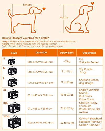 - Die richtige Größe feststellen: Die Hundebox (81 x 58 x 58 cm) ist für Hunde mit einem Gewicht zwischen 16-23 kg geeignet. Empfohlene Rassen: English Springer Spaniel, Bullterrier, Chow-Chow. Beachten Sie die Hinweise für die richtige Messmethode