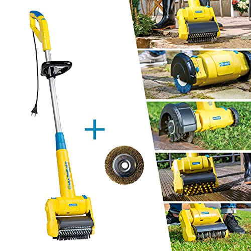 GLORIA MultiBrush speedcontrol – Multifunktionale Elektro-Bürste | Unkrautentferner | Nutzbar als Stein-, Holz-, Fugenreiniger, Rasenkantenschneider, Vertikutierer, Rasenlüfter | Set mit 2 Aufsätzen