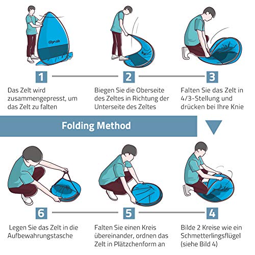 • Ochrona UV: UPF 50+, ochrona przed słońcem, wysoki wskaźnik ochrony przeciwsłonecznej, zapobiegający poparzeniu się słonecznego. Chroni ponad 99% promieni UVA i UVB. Wskazówka: Mimo że namiot posiada powłokę przeciwsłoneczną, należy jednak nosić krem przeciwsłoneczny