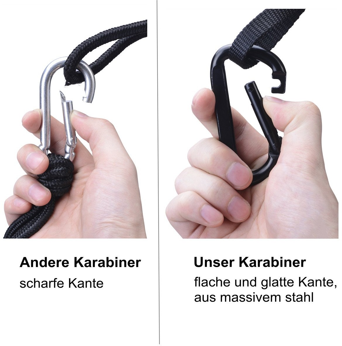 Karabiner: Die Kanten unserer Karabiner sind flach und glatt, aber andere sind scharf. Die scharfen Kanten knnen an Ihrer Hngematte oder den Seilen hngen bleiben.