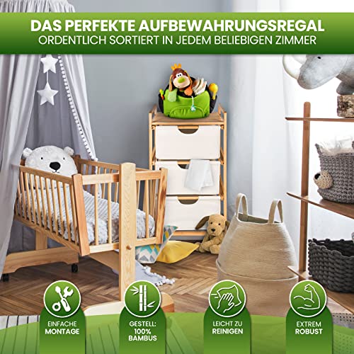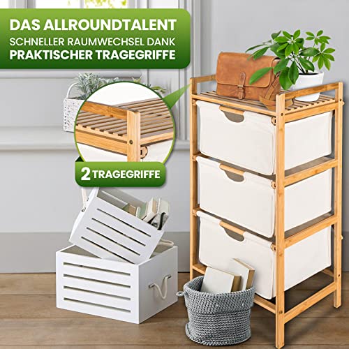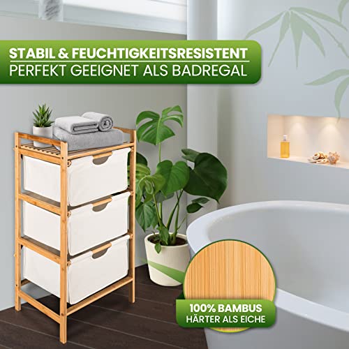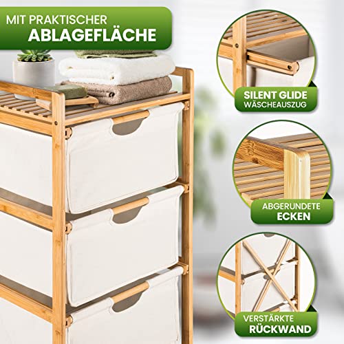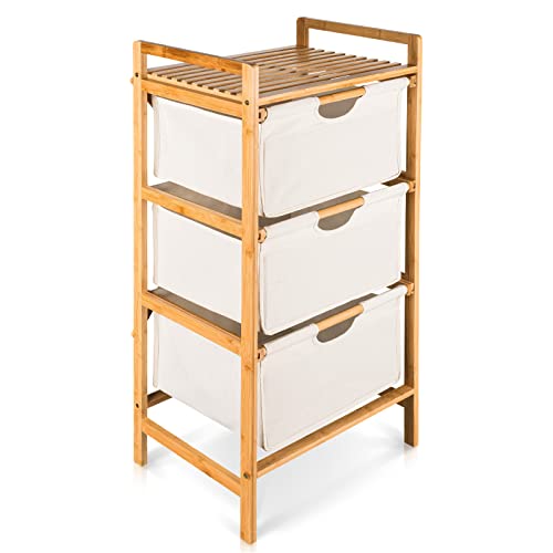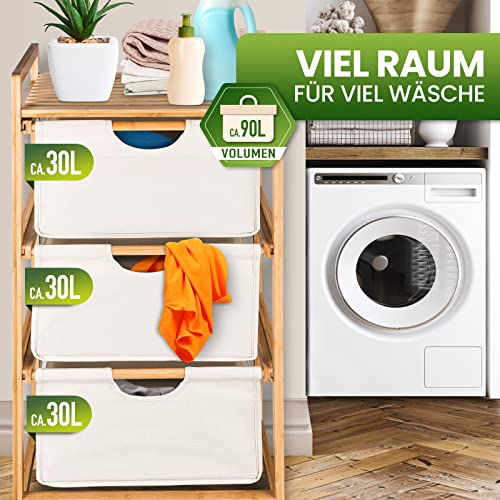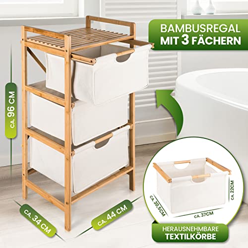 HEIMWERT Kosz na pranie, regał z 3 przegródkami, stabilny kosz do sortowania prania z drewna bambusowego, 44 x 34,5 x 96 cm, do łazienki i sypialni, organizer na pranie z tekstylnym koszem (naturalna biel)