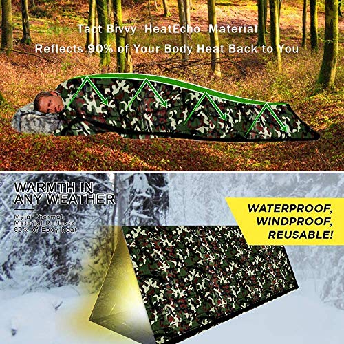 • 【Odporność na deszcz i wiatr. 】 Wodoszczelna i wiatroszczelna torba survivalowa Bivvy jest wykonana z odpornego na rozdarcie materiału polietylenowego z zalakowanymi szwami blokuje trudną pogodę i chroni ją przed najgorszymi warunkami. Odblaskowa strona wewnętrzna chroni przed wychłodzeniem i utrzymuje ciepło dzięki odbijaniu 90% ciepła ciała.