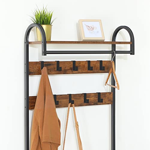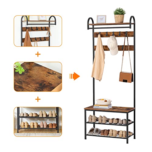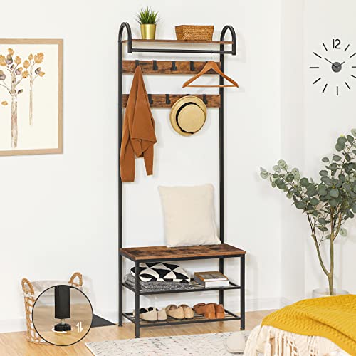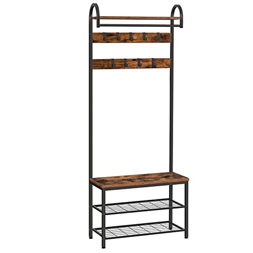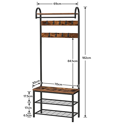 HOOBRO Garderoba, wieszak na ubrania, regał na buty z siedziskiem, stojak na ubrania z 9 haczykami, ławka do siedzenia, drążek na ubrania, wysokość 182 cm, korytarz, salon, metalowa rama, brązowo-czarny EBF13MT01
