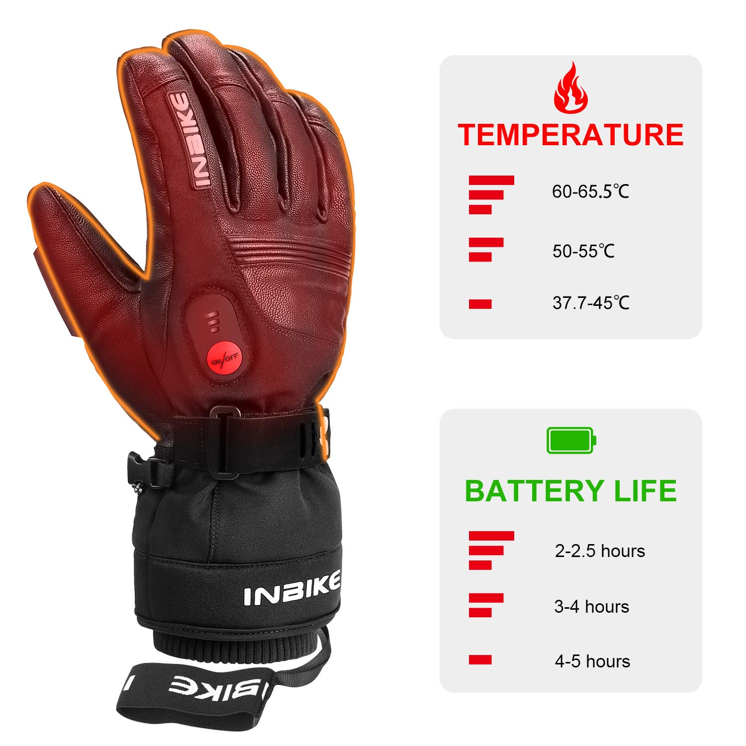 - 【Mutifunktionale beheizbare Handschuhe】 — Die INBIKE-Heizhandschuhe sind Winterwarmhandschuhe mit mehreren Funktionen, schützen Ihre Hände effektiv in kalter Umgebung und halten Sie warm und komfortabel. Geeignet für viele Outdoor-Aktivitäten im Winter. ( Fahrrad, Motorrad, Ski, Snowboard)