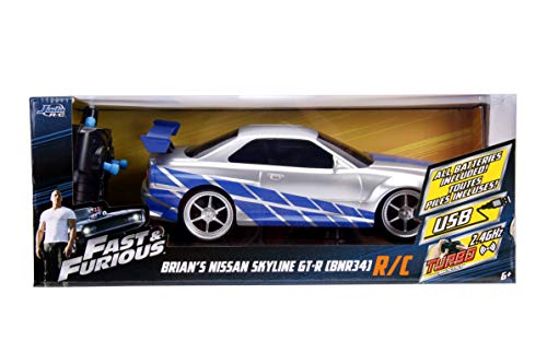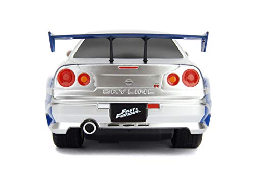 Jada Toys Fast & Furious RC samochód wyścigowy, Nissan Skyline GT-R, R34, samochód zdalnie sterowany, funkcja turbo, dwukanałowy, pilot radiowy, funkcja ładowania USB, baterie w zestawie, 1:16, 29 cm