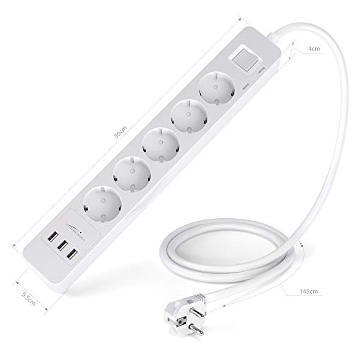 - Praktische Steckdosenleiste mit 5 Steckplätzen und 3 intelligenten USB Ladeanschlüssen mit max. 4.8A (24 W) sowie dezent leuchtenden Status LEDs