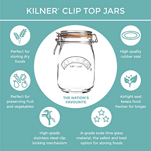 Einzelheiten: Die beliebten runden Kilner Bügelverschluss Gläser sehen nicht nur schick aus, sondern sind zugleich auch besonders strapazierfähig, langlebig und luftdicht verschließbar. Ob konservieren oder eingelegen von Lebensmitteln, das legendäre Kilner Glas mit hochwertigem Bügelverschluss sorgt für die optimale Aufbewahrung Ihrer Lebensmittel und hält sie länger frisch. Dank des hochwertigem Edelstahl Bügelverschlusses mit Dichtungsring sind diese Gläser perfekt für Eingekochtes, wie Marmeladen, Apfelmus, Obst und Gemüse, sowie auch für die Lagerung von Trockenprodukten wie Reis, Mehl, Tee und Kaffee. Neben dem ansprechenden Design sind sie zudem auch besonders robust, mehrfach verwendbar, vielfältig einsetzbar, nachhaltig und spülmaschinengeeignet. Glas ist gut für das Essen. Es besteht aus reinen, natürlichen Rohstoffen, es ist frei von BPA, BPS und Phthalaten und überträgt keine Schadstoffe an die Lebensmittel und somit definitiv gesündere Wahl für die Lagerung, Konservierung und auch für den Gebrauch von Lebensmitteln. Die hochwertigen Edelstahlclips sind so konstruiert, dass die Spannung 100% perfekt ist, damit wird die ideale Abdichtung bei jedem Mal gewährleistet. Zudem ist Glas nachhaltig, wiederverwendbar und recycelbar. Und somit ein positiver Beitrag für unsere Umwelt.