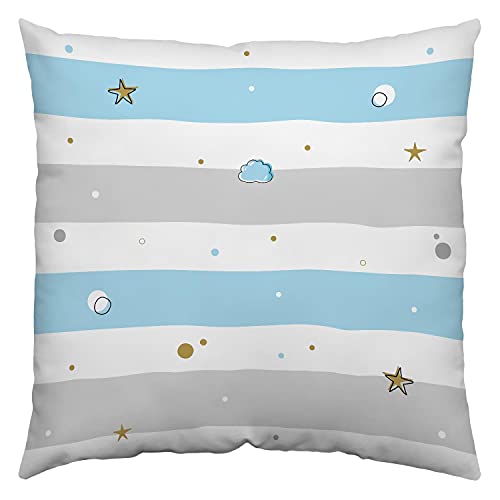• Poduszka z dwustronnym motywem, z przodu figurka Sheepworld z sentencją, tylna strona w paski, jasnoniebieska, szara i biała