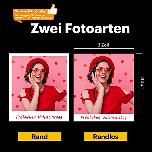 • Wysokiej jakości druk fotograficzny: technologia 4pass umożliwia natychmiastowe drukowanie obrazów o wysokiej rozdzielczości. Laminowanie ochronne zachowuje kolory zdjęć i chroni zdjęcie przed wodą i odciskami palców. Kwadratowy format jest idealny do drukowania zdjęć profilu Instagramu i przechowywania na zawsze. Ponadto można wybrać, czy drukujesz zdjęcia z marginesem lub bez krawędzi, aby uzyskać jeszcze indywidualny efekt