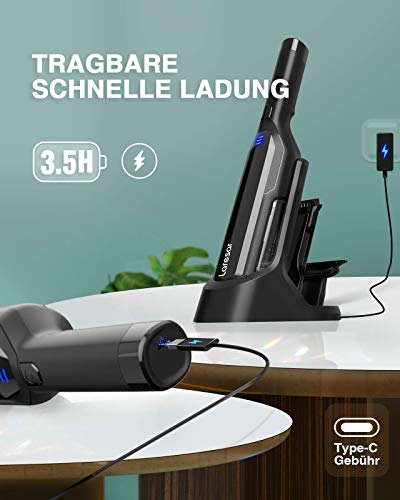 - 🔋【Kurze Ladezeit, Lange Laufzeit】2 Ladetype: Das Ladegerät vom Type-C kann überall schnell aufladen. Praktische Ladestation zum Aufladen und optimalen Aufbewahren. Mit einem 3000mAh Lithium-Ionen Akku mit großer Kapazität und Schnellladetechnologie kann der Staubsauger kann in nur 3-4h vollständig aufgeladen werden. Dann bietet er 20-30min ununterbrochenen Betrieb.