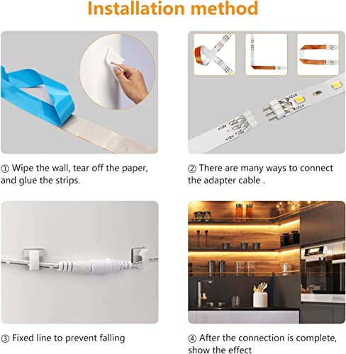 • 【Łatwy montaż i obsługa】 Wyposażony w dwustronną taśmę klejącą, 5 wtyczek przedłużających i wszystkie akcesoria do instalacji produktu. Wystarczy oczyścić powierzchnię, nakleić taśmę świetlną i można jej użyć