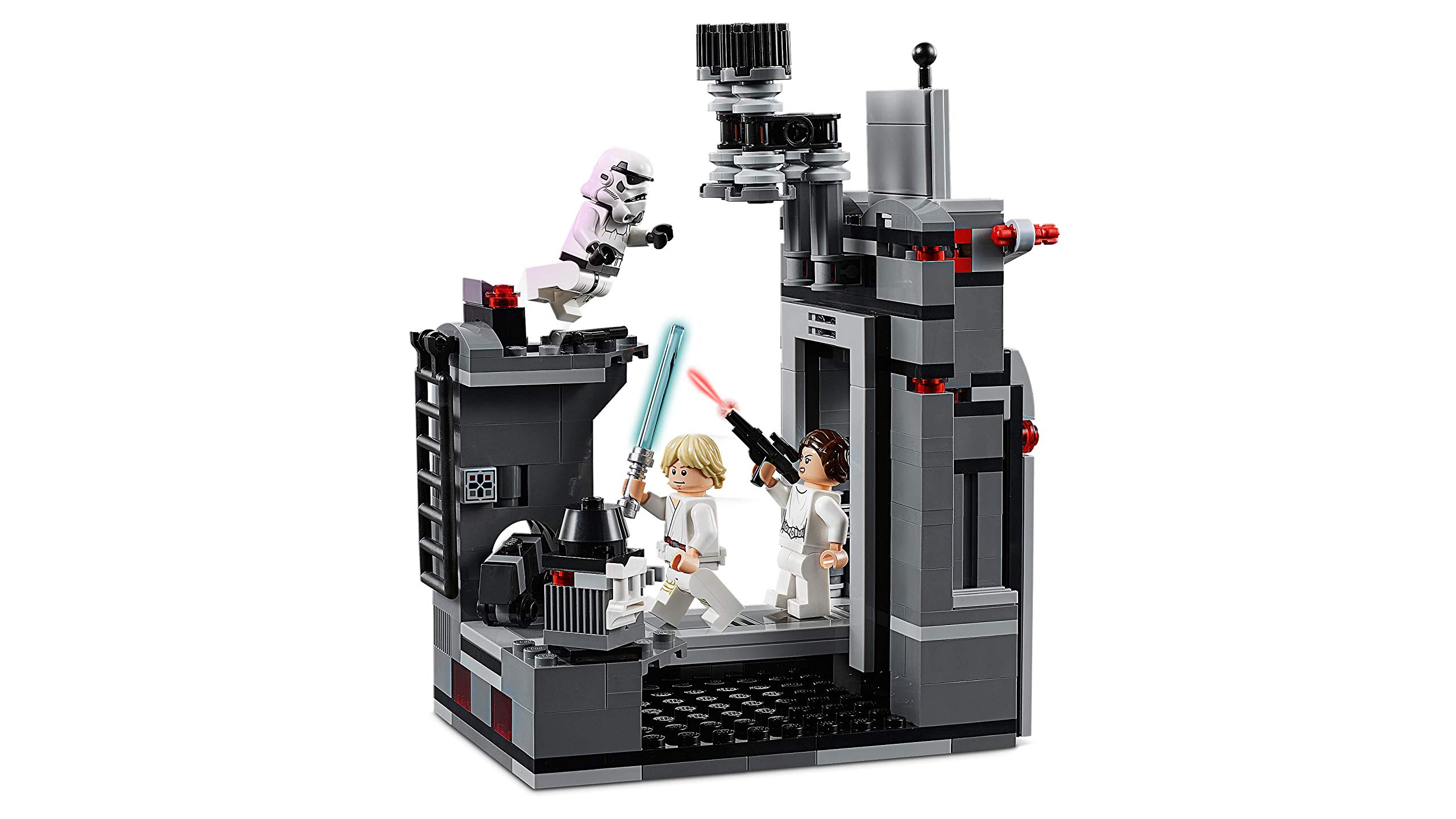 - Das Set beinhaltet eine seitlich aufklappbare Todesstern-Umgebung mit einem Eingang, einer mit Hebel zu öffnenden Tür und einem einfahrbaren Gang, und ein zweites Element mit Säule, Plattform, Leiter, verstecktem Mouse Droid und einer Box zum Öffnen mit einem Elektrofernglas im Inneren sowie der Funktion, den Stormtrooper vom Turm fallen zu lassen.