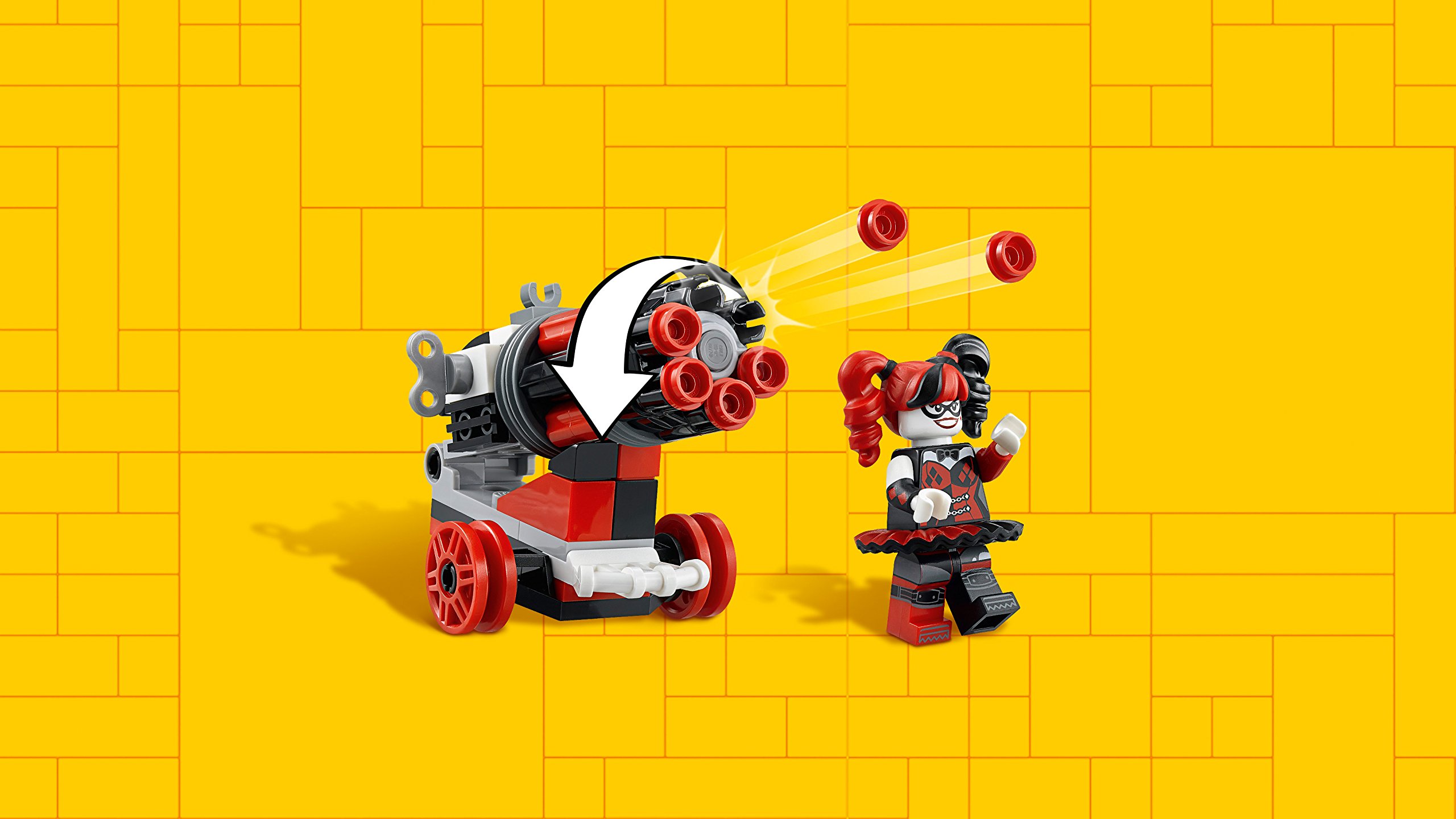 - Zawiera Batmana, Robina i Harley Quinn z działem szybkostrzelnym i młotkiem