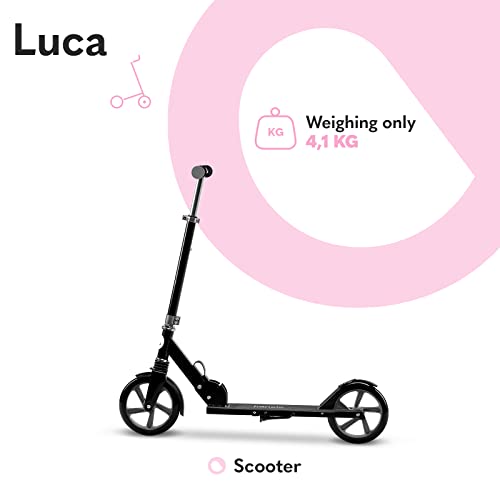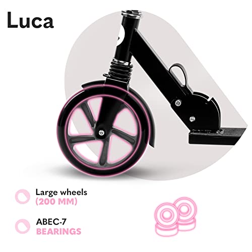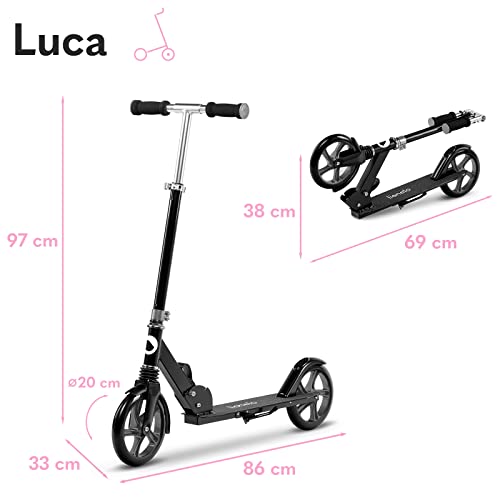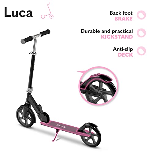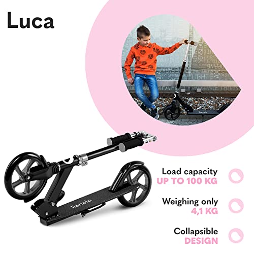 LIONELO Luca hulajnoga do 100 kg, lekka wytrzymała, składana konstrukcja, amortyzator, duże koła, regulowana wysokość kierownicy, antypoślizgowy podes