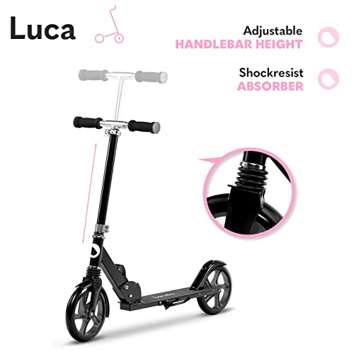 LIONELO Luca hulajnoga do 100 kg, lekka wytrzymała, składana konstrukcja, amortyzator, duże koła, regulowana wysokość kierownicy, antypoślizgowy podest, amortyzacja ShockResist