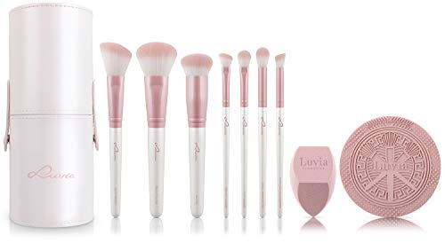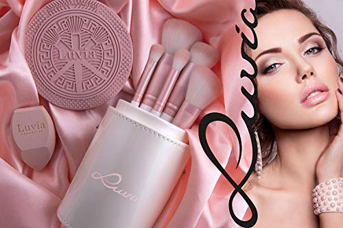 Zestaw pędzli do makijażu Luvia, Prime Vegan Pro – Candy, 7 pędzli do makijażu, w tym pojemnik na pędzle, gąbka do blendowania i mata do czyszczenia pędzli kosmetycznych, w kolorze perłowym i różowym
