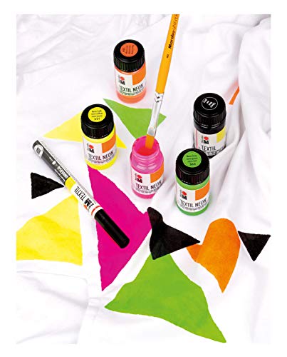 Marabu 1711000000080 – Textil Neon Set, fluoreszierende, intensive Tageslichtfarbe für helle Textilien, leuchtet im Schwarzlicht, 4 x 15 ml Neonfarbe, 15 ml Textilfarbe, Textil Painter und Pinsel