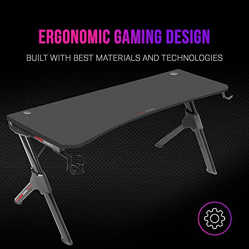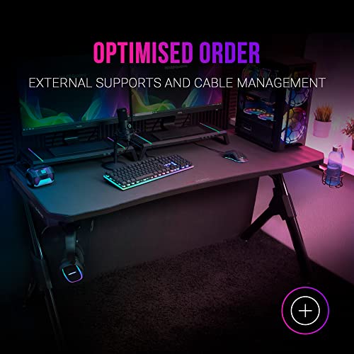 • Stojaki zewnętrzne i zarządzanie kablami: Zoptymalizuj przestrzeń, utrzymując wszystko w porządku dzięki dołączonym zewnętrznym stojakom na słuchawki i napoje; możesz również łatwo zarządzać kablami za pomocą dołączonych do stołu otworów do zarządzania kablami