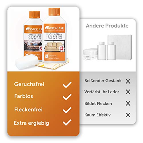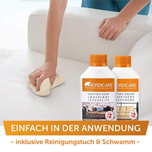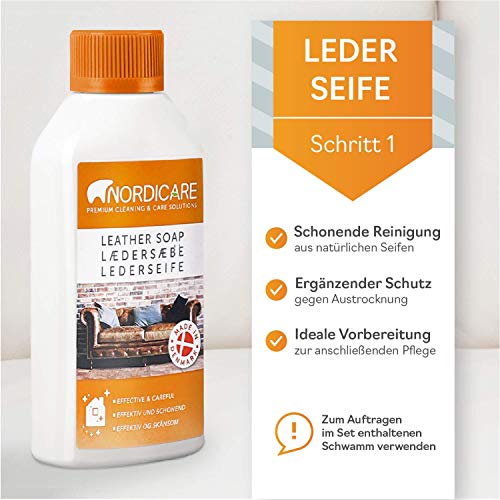 Czyści i chroni: Czyści i chroni – usuwanie brudu i intensywna ochrona wszystkich naturalnych, wrażliwych na plamy skór z linią do pielęgnacji skóry Nordicare Niezależnie od tego, czy na sofie, skórzanych siedzeniach, skórzanych samochodach lub skórzanej kierownicy – wysokiej jakości zestaw do pielęgnacji z mydłem i